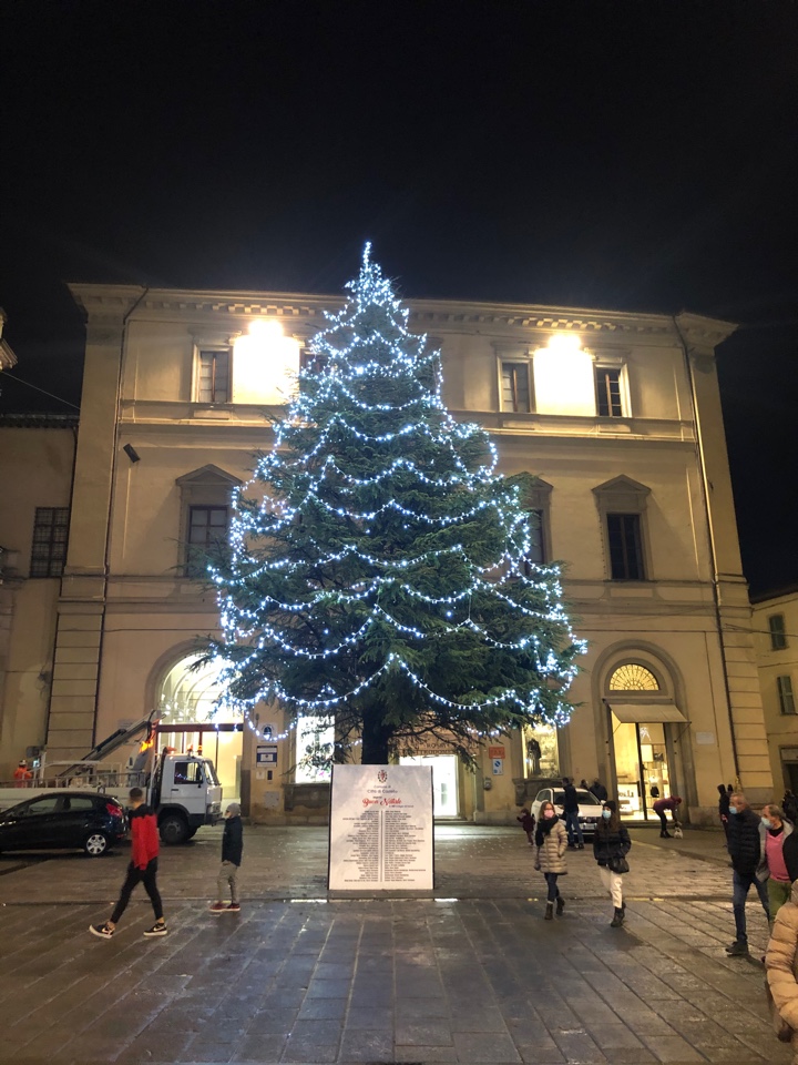 Un albero di quindici metri illuminato con luci bianche e addobbato secondo la migliore tradizione natalizia. Alla base del maestoso abete quattro pannelli colorati con gli auguri di Buon Natale “multietnici” in tutte le lingue del mondo dalla A alla Z. Un modo alquanto originale di aprire il periodo di festività natalizie e di fine anno segnato dall’emergenza da Covid-19 che ha purtroppo costretto a rinunciare a tante manifestazioni importanti della città. Proprio per questo nel pomeriggio l’accensione dell’albero di Natale (collocato in piazza Matteotti ad angolo fra il Loggiato Gilldoni e della Cassa di Risparmio) e delle luminarie del centro storico rappresenta forse ancora più la tradizione ed un messaggio di normalità e di speranza. A causa del maltempo l’esibizione ideata ed organizzata dall’Associazione Castello Danza assieme ad alcuni musicisti è stata posticipata a domenica prossima nel pomeriggio a partire dalle ore 18 sempre in Piazza Matteotti. “La tradizione è rispettata. Con l’accensione delle luci dell’albero e delle luminarie nel centro storico proprio nel giorno dell’Immacolata diamo il via ad una serie di iniziative in sicurezza e secondo le normative vigenti per iniziare stando uniti e insieme un periodo delle festività che sarà anomalo e che dobbiamo vivere con la maggiore serenità possibile”, è quanto dichiarato dal sindaco Luciano Bacchetta e dall’assessore al Commercio e al Turismo Riccardo Carletti, subito dopo l’accensione delle luci dell’albero di Natale in piazza Matteotti rinnovando ancora gli auguri di buone feste a tutti i tifernati e non solo.