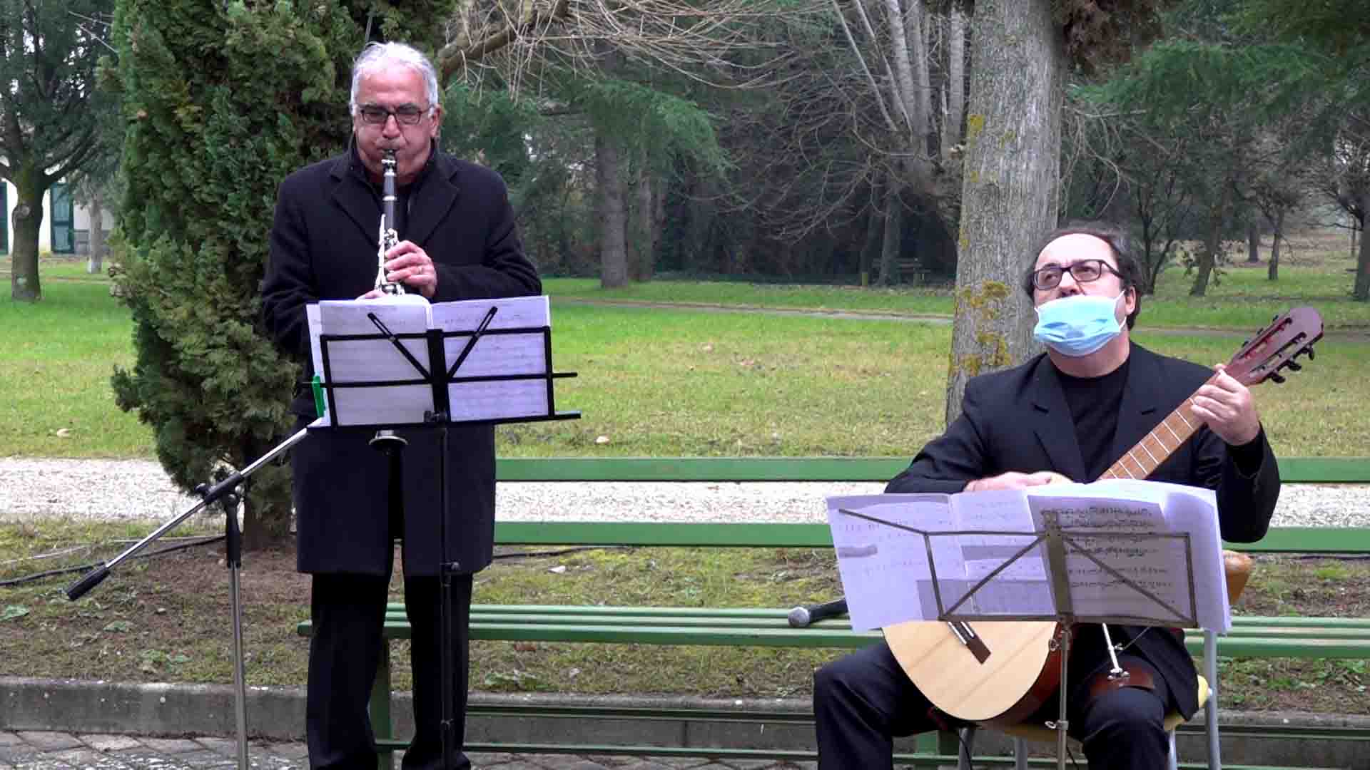 Dal palcoscenico del teatro al parco della residenza protetta per il concerto di Natale, omaggio agli anziani ospiti: la musica filtra dalle ampie vetrate e si irradia da un interfono istallato per consentire le visite dei familiari senza pericolosi contatti fisici. In “platea” fra gli alberi e le panchine, il sindaco di Città di Castello, Luciano Bacchetta, il vescovo, Monsignor, Domenico Cancian, la Presidente dell’Asp, Andreina Ciubini ed alcuni operatori sanitari e familiari. Le colonne sonore e la melodia struggente dei capolavori del maestro Ennio Morricone, “C’era una volta il West”, “Amapola”, “Per un pugno di dollari”, “l buono il brutto e il cattivo” e un medley di brani natalizi interpretati magistralmente dai maestri, Fabio Battistelli, noto clarinettista (protagonista di numerose iniziative e concerti a distanza durante il lockdown) e Stefano Falleri alla chitarra hanno trasformato il giardino della residenza protetta per anziani, la A.S.P. Muzi Betti, ubicata a Città di Castello a poche centinaia di metri dal centro cittadino, in un vero proprio teatro all’aperto. Il Covid non è riuscito a fermare la solidarietà ed il desiderio di far vivere ai circa 90 ospiti della struttura, con elevato livello di integrazione socio sanitaria, momenti indimenticabili, commoventi di un atmosfera natalizia e tradizioni secolari che la pandemia e le regole connesse al distanziamento sociale ha però inevitabilmente limitato. Grazie alla tecnologia e alla ubicazione della struttura con ampie vetrate la magia del Natale si è ripetuta. “Ad inizio del 2020 purtroppo ci siamo addormentati in un mondo e ci siamo svegliati in un altro. Improvvisamente la nostra struttura – ha dichiarato Andreina Ciubini, Presidente del Consiglio di Amministrazione di Asp, Muzi Betti - che è stata sempre aperta a tutti in qualsiasi ora della giornata, ha dovuto chiudere le sue porte e i contatti sono avvenuti solo attraverso videochiamate. Giorni fa abbiamo pensato di installare davanti ad una vetrata un interfono, in modo che oltre al contatto visivo è stato possibile avere un contatto verbale, per dare la possibilità agli ospiti e ai parenti di vedere e sentire quelle voci care che per troppo tempo erano rimaste nel silenzio in questi mesi. Questa novità è stata molto apprezzata dai familiari degli ospiti che in questo modo hanno potuto far sentire il loro affetto e la loro vicinanza. Non potendo rinnovare all'interno della struttura come ogni anno la tradizionale cena, i numerosi canti dei bambini e dei ragazzi delle scuole, l'affetto e la vicinanza della associazioni che rallegravano gli anziani con la loro presenza e i dolci tradizionali portati in dono, le feste natalizie rischiavano di essere un periodo ancora più triste. Oggi – ha concluso con evidente commozione la Presidente della struttura – attraverso la musica dedicata a loro dal Maestro Fabio Battistelli e dal maestro Stefano Falleri si è potuto ricreare quell'atmosfera natalizia che sembrava irrimediabilmente perduta. Un sentito ringraziamento da parte di tutti noi, dal consiglio di amministrazione, dai dipendenti della struttura a tutti i livelli che con il loro prezioso e quotidiano lavoro ci consentono di raggiungere livelli di gestione ed assistenza elevate, anche al sindaco Luciano Bacchetta, al Vescovo, Monsignor Domenico Cancian e a tutti i presenti”. Il Vescovo, Domenico Cancian, prima della preghiera e delle note del concerto ha definito straordinaria questa giornata con gli anziani della residenza protetta. “È proprio un bel sacrificio per voi che siete soli e non potete abbracciare i parenti e in particolare i carissimi nipoti. Abbiamo però, grazie ai vostri responsabili – ha detto il presule - la bella opportunità di vederci attraverso una vetrata e comunicare per mezzo di un citofono. In questo modo anche i vostri cari parenti e amici potranno vedervi, parlarvi e sorridervi. Attraverso questa vetrata potete adesso sentire anzitutto le belle musiche di Fabio Battistelli, il nostro grande artista che ben volentieri è venuto qui a suonare per voi i dolci canti natalizi col suo magico clarinetto: grazie anche al maestro Stefano Falleri che lo ha accompagnato con la sua chitarra”. “Sentiamo il dovere di fare gli auguri con tanto amore perché voi siete stati e siete i più penalizzati dalla pandemia che purtroppo si accanisce contro i più fragili. Insieme a voi che siete qui ricordiamo tutti gli altri anziani che sono accolti nelle RSA e nelle case di accoglienza del nostro territorio ed anche in tutto il mondo. Come vescovo mi permetto di donare una benedizione speciale a tutti voi perché questo Natale così particolare non faccia sentire toppo forte la sofferenza della lontananza fisica. Siate certi che noi tutti vi pensiamo, impegnandoci, appena possibile, di recuperare in modo significativo le relazioni con voi.” Una giornata indimenticabile anche per il sindaco Luciano Bacchetta, fra le note di colonne sonore mozzafiato e i sorrisi degli ospiti che si intravedevano al di là delle vetrate. “Come tutti sappiamo il problema della solitudine delle persone anziane, che in periodo di Covid è particolarmente forte, richiede un supporto psicologico costante perché le misure di prevenzione del contagio impediscono purtroppo contatti diretti, specie con persone fragili e in età avanzata come sono gli ospiti della Muzi Betti”, ha rimarcato il sindaco, giudicando “molto intelligente l’accorgimento di un interfono e delle vetrate per le visite dei parenti adottato presso la residenza sanitaria”. “Facciamo i complimenti alla presidente Andreina Ciubini e al suo staff, perché questa soluzione consente visite in assoluta sicurezza, garantendo le norme prudenziali necessarie quando si entra in contatto con persone anziane.” “Noi saremo qui non solo a Natale – ha concluso il sindaco Bacchetta - e grazie a queste tecnologie non mancheremo di far sentire con la presenza ed