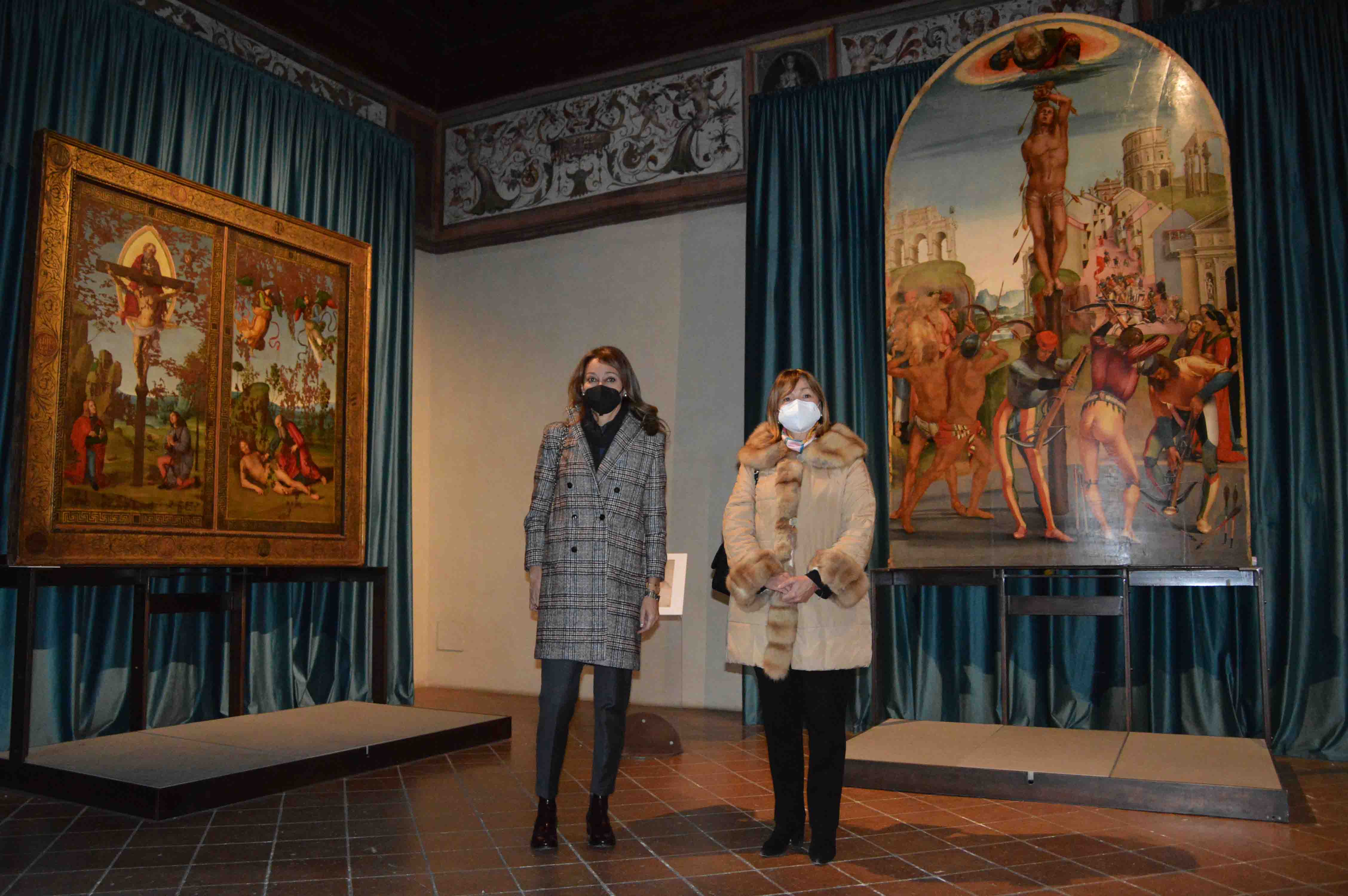 Negli spazi della Pinacoteca comunale, che ha da poco recuperato il suo ingresso monumentale originario, introdotto da un bel portale cinquecentesco, è possibile godere di un’esposizione dall’alto valore storico artistico, molto apprezzata dal pubblico fino a questo momento. Elemento di grande spessore della mostra, divenuto esposizione permanente, è l’allestimento che vede lo Stendardo della santissima Trinità di Raffaello e il Martirio di San Sebastiano di Signorelli ‘vis a vis’ nella stessa sala. Un accostamento che simboleggia l’incontro tra due grandi artisti che nella realtà non si sono mai conosciuti. Cuore della mostra è il Gonfalone a doppia faccia di Raffaello, unica sua opera mobile rimasta in Umbria, proveniente dalla Confraternita della Santissima Trinità di Città di Castello, ora conservato in Pinacoteca e prima sottoposto a uno straordinario restauro di reintegrazione estetica direttamente sorvegliato dall’Istituto Centrale per il Restauro (ICR) di Roma. La mostra, curata da Marica Mercalli, già Soprintendente dell’Umbria e ora direttore generale per la sicurezza del Patrimonio culturale del Ministero della cultura, e Laura Teza, professoressa associata di Storia dell’Arte moderna dell’Università degli studi di Perugia, è realizzata anche con il contributo del Gal Alta Umbria, PAL 2014 - 2020 ‘Umbria lasciati sorprendere’. In questo percorso espositivo, la Pinacoteca comunale ospita, per la prima volta insieme, tre frammenti del primo dipinto tifernate di Raffaello, la grande tavola de ‘L’Incoronazione di san Nicola da Tolentino’, danneggiata nel terremoto del 1789: l’Eterno e la Vergine, custoditi a Napoli (Museo Nazionale di Capodimonte), e la testa di Angelo, custodita nella Pinacoteca Tosio Martinengo a Brescia. Per la mostra è stata anche realizzata una ricostruzione virtuale dell’opera, che ne ripropone la fisionomia complessiva ed entrerà a far parte in maniera definitiva del percorso di visita della Pinacoteca.