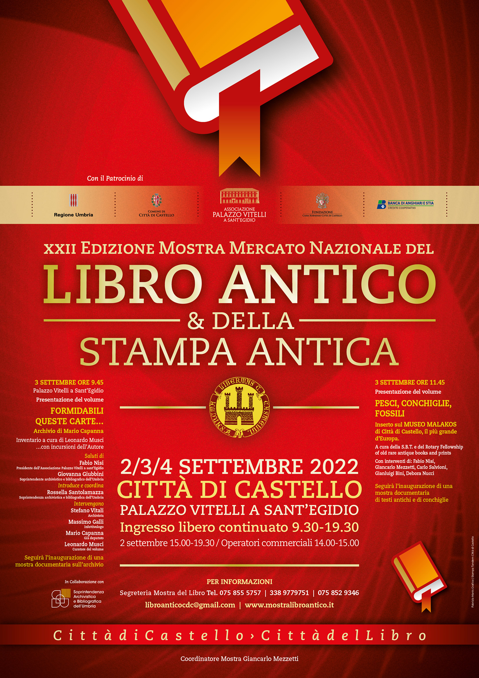 Da venerdì 2 a domenica 4 settembre Città di Castello sarà la capitale della stampa d’autore d’epoca e della bibliografia con le rarità da tutto il mondo in vetrina alla XXII Mostra Mercato del Libro Antico e della Stampa Antica, promossa dall’Associazione Palazzo Vitelli a Sant’Egidio con la collaborazione del Comune di Città di Castello. L’architettura rinascimentale di Palazzo Vitelli a Sant’Egidio accoglierà 40 espositori provenienti dall’Italia e dall’estero che presenteranno al pubblico una produzione di alto livello per rarità, qualità e anno di realizzazione, che comprenderà codici manoscritti e miniati, incunaboli, testi scientifici illustrati dei secoli XVI-XIX, rare prime edizioni letterarie del 1900, opere cartografiche, incisioni di antichi maestri, vedutistica e grafica moderna di artisti di livello internazionale. La mostra aprirà alle ore 15.00 di venerdì 2 settembre e potrà essere visitata a ingresso libero fino alle ore 19.30, con una fascia oraria riservata agli operatori commerciali dalle ore 14.00 alle ore 15.00. Alle ore 9.30 di sabato 3 settembre si terrà l’inaugurazione ufficiale dell’esposizione, con la partecipazione del sindaco e dell’assessorato al Commercio e al Turismo, del presidente dell’Associazione Palazzo Vitelli a Sant’Egidio Fabio Nisi, del curatore e responsabile scientifico Giancarlo Mezzetti. Dopo il taglio del nastro la mostra potrà essere visitata fino alle 19.30 di sabato e dalle ore 9.30 alle ore 19.30 di domenica. Tra i pezzi pregiati in vendita ci sarà l’unica copia conosciuta di un trattato manoscritto e miniato della seconda metà del Cinquecento per l’insegnamento della musica, stimato decine di migliaia di euro. Accanto alle rarità in mostra, attraverso due iniziative collaterali, a cui saranno abbinate altrettante mostre a tema, i visitatori avranno l’opportunità di conoscere il patrimonio storico, artistico e culturale della città attraverso i personaggi e le esperienze che presenteranno testimonianze importanti della storia e dell’attualità. Il Sessantotto e la rivoluzionaria mobilitazione culturale, sociale e politica contro gli apparati di potere dominanti e le loro ideologie rivivranno nel duetto inedito e appassionato tra due protagonisti dell’epoca, l’onorevole Mario Capanna e l’infettivologo Massimo Galli, tra gli esperti più coinvolti nel dibattito scientifico sul Covid-19, che saranno protagonisti della prima conferenza in programma alle ore 9.45 a palazzo Vitelli a Sant’Egidio. Nell’occasione verrà presentata l’opera intitolata “Formidabili queste carte…L’archivio di Mario Capanna”, inventario a cura di Leonardo Musci, alla presenza di Rossella Santolamazza della Soprintendenza archivistica e bibliografica dell’Umbria, il presidente Fabio Nisi, Giovanna Giubbini, soprintendente archivistico e bibliografico dell’Umbria, Stefano Vitali, archivista ex direttore dell’Archivio Centrale dello Stato. Le oltre 600 mila conchiglie che fanno parte della raccolta privata più grande d’Europa custodita al museo Malakos di Città di Castello saranno l’altro motivo di interesse della mattinata di conferenze. Con l’iniziativa in programma alle 11.45, sempre a palazzo Vitelli a Sant’Egidio sarà presentato il volume intitolato “Pesci, conchiglie, fossili”, con inserto sulla collezione tifernate, che è stato curato dalla S.B.T. e dal Rotary Fellowship of old rare antique books and prints. A parlare delle meraviglie del mare saranno il fondatore del museo, Gianluigi Bini, la direttrice operativa della collezione Debora Nucci con la ricercatrice Beatrice Santucci, il presidente Nisi, il curatore della manifestazione Mezzetti e Carlo Salvioni per il Rotary Fellowship of old rare antique books and prints. Nell’ambito della XXII Mostra Mercato del Libro Antico e della Stampa Antica sarà possibile visitare il Museo del Duomo, che ospita la Regola di Sant’Agostino dell’XI secolo, i Capitoli di Sant’Antonio del XIV secolo e la Pergamena di Federico Barbarossa del 1163 con sigillo autentico (info: direttrice Catia Cecchetti, museo@diocesidicastello.it); Il laboratorio di restauro “Memorie di Carta” in via Bufalini (venerdì pomeriggio, sabato e domenica mattina con referente il maestro Stefano Mastriforti); la Tipografia Grifani Donati, museo vivente delle arti grafiche in attività dal 1799 (referente il maestro impressore Gianni Ottaviani); il Museo Storico Stabilimento Tipografico Pliniana (referente Giorgio Zangarelli). Per informazioni sarà possibile consultare il sito web www.mostralibroantico.it o rivolgersi alla segreteria della mostra attraverso i recapiti telefonici 075.8555757, 338.9779751 e 075.8529346 e l’indirizzo di posta elettronica libroanticocdc@gmail.com.