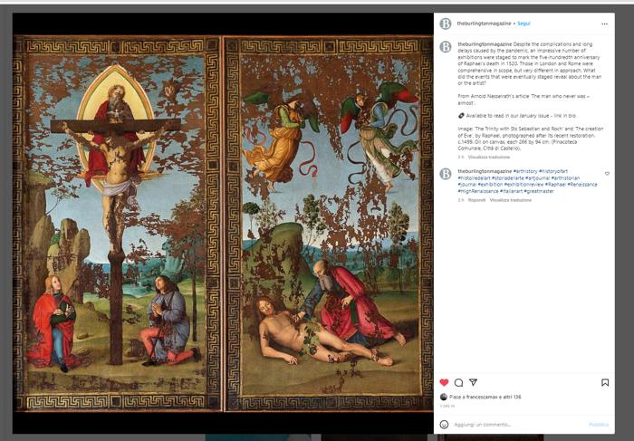 Lo stendardo di Raffaello sul Instagram del Burlington Magazine, prestigiosa rivista mondiale dedicata alle belle arti e alle arti decorative. Secondi e Botteghi: Capitalizziamo il Cinquecentenario di Raffaello e lavoriamo a quello di Signorelli