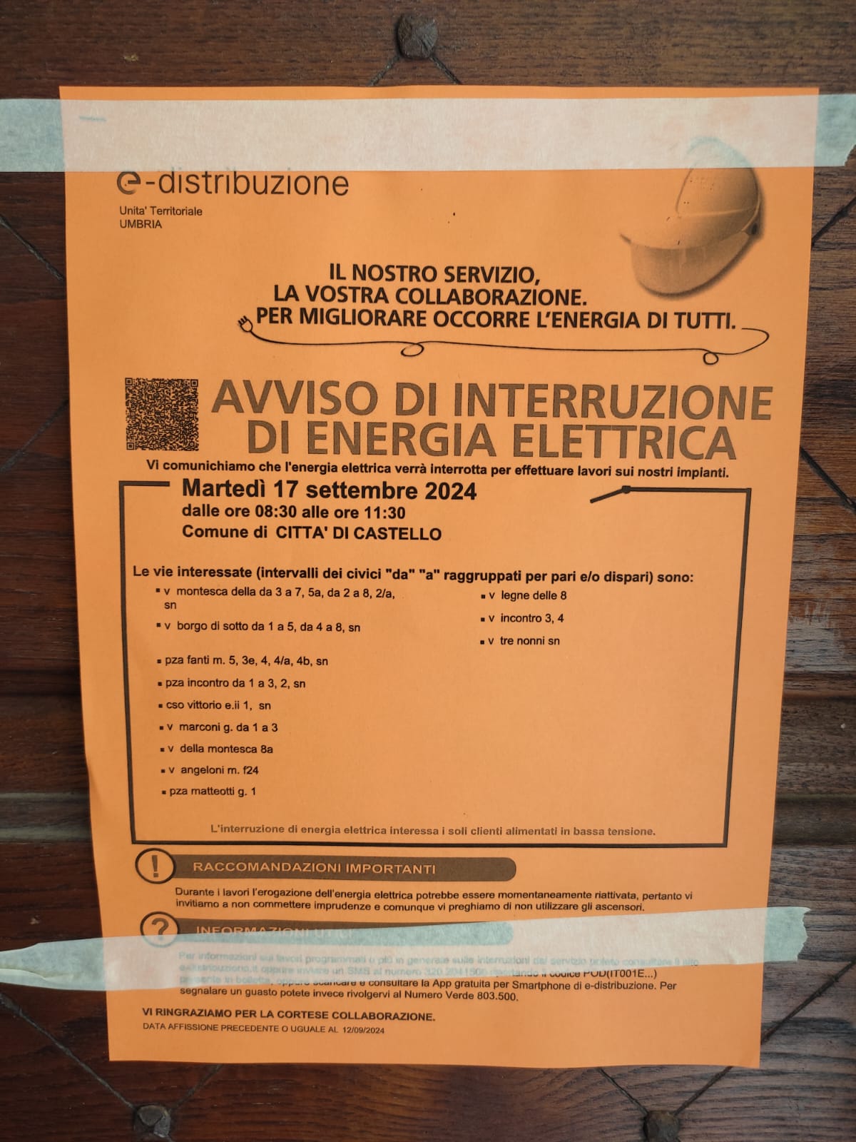 Come da comunicazione di Enel distribuzione si informa che Martedi 17 Settembre 2024 dalle ore 8,30 alle ore 11,30 l’energia elettrica verrą interrotta per effettuare lavori sugli impianti. Le vie interessate (intervalli civici da “a” raggruppati per pari e/o dispari) sono: