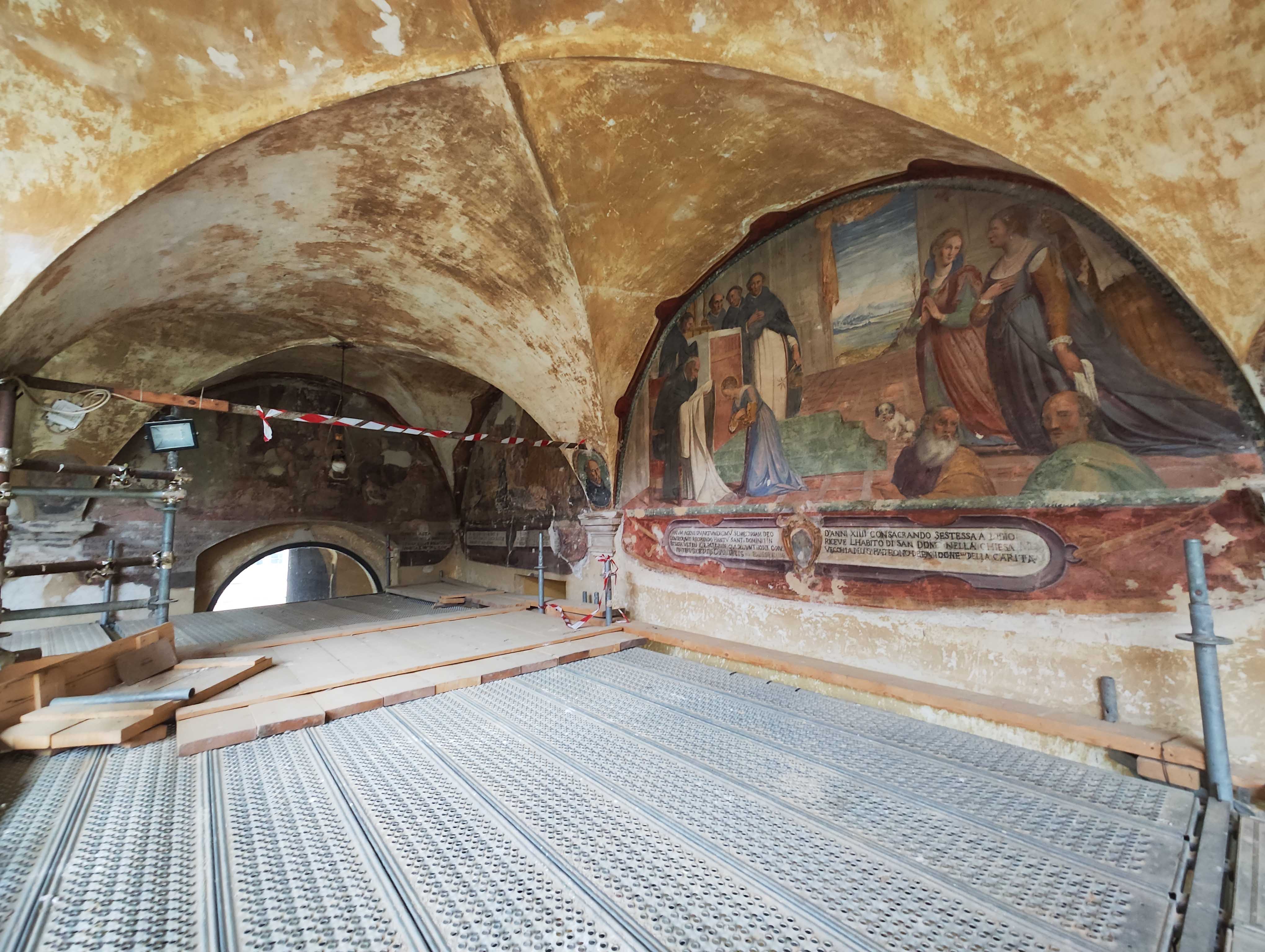 L'Intervento. La ristrutturazione e la riqualificazione del complesso del chiostro di San Domenico e dell’ex Chiesa della Carità sono stati avviati con l’obiettivo di restituire questi contenitori alla comunità, adeguandoli alle norme di sicurezza e dotandoli di nuove funzioni per renderli più vivi e coinvolgenti. Il restauro del chiostro di San Domenico, in particolare, non rappresenta solo una necessità edilizia, ma è anche un’importante operazione culturale, considerando che l’edificio è una delle testimonianze storiche più significative della città. I lavori si stanno concentrando inizialmente sulle facciate esterne e sulle opere strutturali puntuali, come il consolidamento delle catene, la messa in sicurezza delle strutture lignee del vano scala e il restauro della facciata prospiciente piazza dell’Archeologia. Il restauro delle superfici dipinte è uno degli aspetti più importanti degli interventi conservativi in corso, che sono mirati a proteggere e valorizzare le importanti decorazioni pittoriche del chiostro e della chiesa. Le altre operazioni riguardano il ripristino degli intonaci originali, con l’attenzione particolare alle porzioni esterne e interne che conservano parti originali, soprattutto nei prospetti affacciati sul chiostro; il restauro degli elementi in pietra, con il trattamento di ogni dettaglio in base a un approccio conservativo, volto a proteggere le superfici senza alterarle; il restauro delle parti lignee, con la sostituzione degli infissi e delle strutture di scarsa qualità con elementi più adatti e in armonia con il contesto storico. C’è poi il restauro degli apparati decorativi interni, con le 32 lunette affrescate dedicate alla Beata Margherita della Metola, gli intonaci storici, le pitture murarie policrome, gli elementi in pietra costituiti da colonne del piano terra e del primo piano, i cornicioni in pietra, le facciate storiche, gli elementi lignei e metallici, le modanature architettoniche. Le operazioni di restauro conservativo, al fine di recuperare e valorizzare l’immagine autentica del complesso, seguono un iter metodologico comprendente la rimozione dei depositi e la pulitura delle superfici; il consolidamento preliminare della pellicola pittorica per stabilizzarla; la riadesione degli intonaci distaccati; la stuccatura delle lesioni e delle lacune; interventi estetici per restituire coerenza alle superfici; protezione finale delle superfici. Tra le testimonianze storiche e artistiche di maggior pregio che saranno valorizzate dall’intervento, spiccano quelle legate alla presenza dell’Ordine dei Cavalieri Templari a Città di Castello prima dell’avvento dei Domenicani, i quali nel XIV secolo trasformarono la Chiesa della Carità in refettorio del convento, coprendo gli affreschi di origine templare con la raffigurazione di un cenacolo ed erigendo l’attuale Chiesa di San Domenico nel lato opposto del chiostro. La facciata rivolta verso piazza delle Tabacchine, caratterizzata da stratificazioni storiche, inclusa una fase legata alla lavorazione del tabacco, è oggetto di un attento restauro per rispettarne e conservarne le peculiarità. Dove necessario, si sta intervenendo con la tecnica del “scuci e cuci”, utilizzando materiali recuperati in loco. Le pavimentazioni esistenti del complesso sono sottoposte a interventi di restauro puntuale, con integrazioni laddove richiesto dagli impianti tecnici ed è in corso la realizzazione di una rampa presso l’ex Chiesa della Carità per garantire una piena fruibilità degli spazi collegati con la piazza. A completare l’intervento è l’adeguamento e, laddove necessario, il completo rifacimento degli impianti elettrici, idrico-sanitari, termici, di ventilazione, audio-video e di irrigazione. In conformità con le linee guida del PNRR, il cantiere è gestito con particolare attenzione alla sostenibilità, utilizzando materiali certificati CAM/EPD e puntando a ridurre al minimo l’impatto ambientale dei lavori per quanto riguarda i rifiuti.