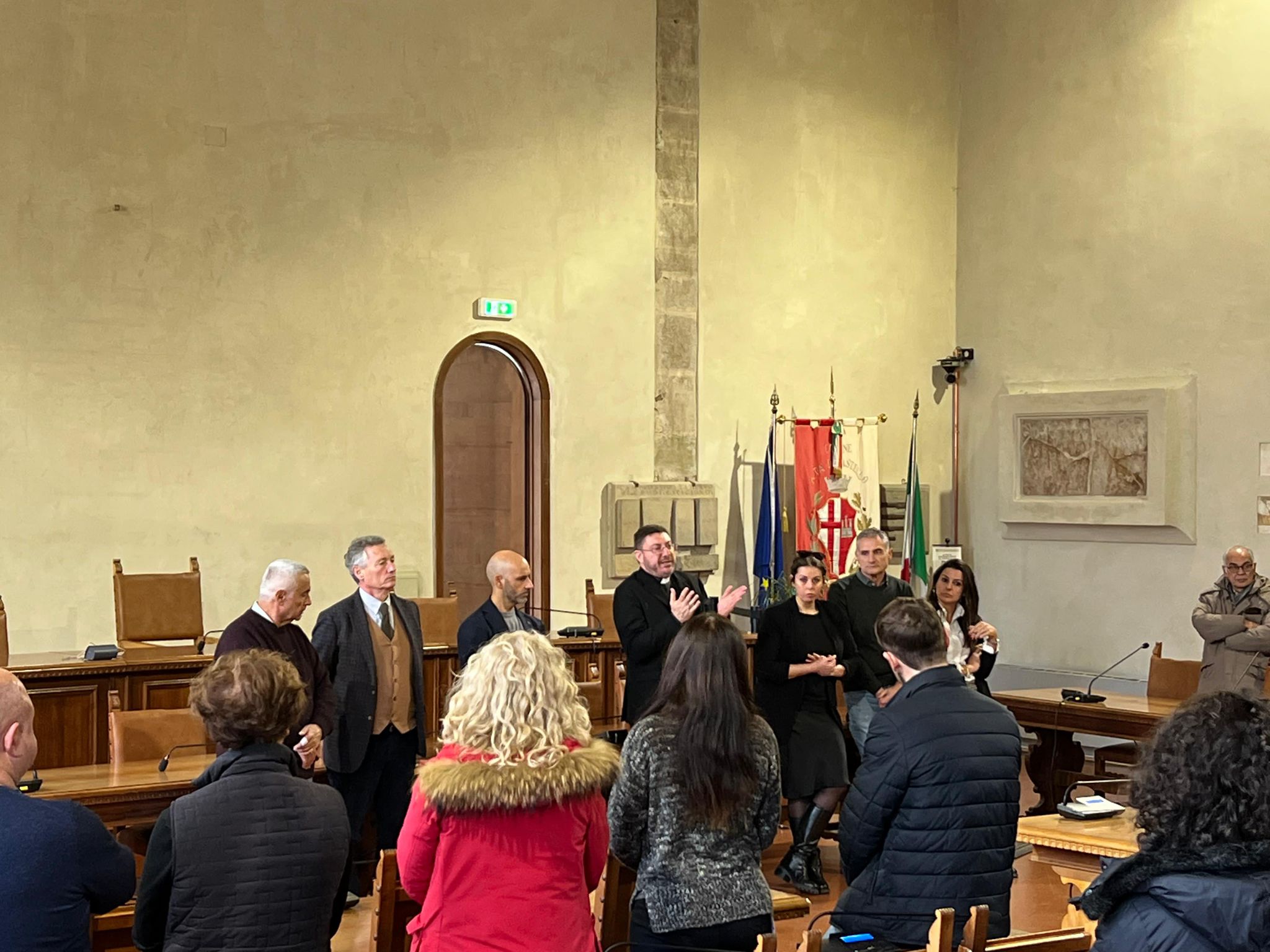 Tradizionale scambio di auguri nella sala del consiglio comunale di Cittā di Castello tra l’amministrazione comunale e la Diocesi tifernate. Il sindaco Luca Secondi ha accolto insieme alla giunta il vescovo monsignor Luciano Paolucci Bedini, alla presenza del presidente del consiglio comunale Luciano Bacchetta, di alcuni componenti dell’assise e dei dipendenti dell’ente. E’ stata l’occasione per ribadire la reciproca collaborazione e per rinnovare l’impegno ad affrontare insieme, ognuno per quanto di competenza, le sfide che propone una comunitā nella quale sono ancora saldi i connotati di coesione e solidarietā propri dell’identitā tifernate, ma sono anche presenti fenomeni sociali ed economici che richiedono attenzione e vicinanza alle persone fragili. Nell’occasione sindaco e vescovo si sono ritrovati insieme anche per ammirare il presepe allestito all’ingresso degli uffici comunali. L’opera del compianto artista Giulio Mariucci, č stata messa a disposizione dall’associazione “Amici del Presepio di Cittā di Castello Gualtiero Angelini” presieduta dal cavalier Lucio Ciarabelli.