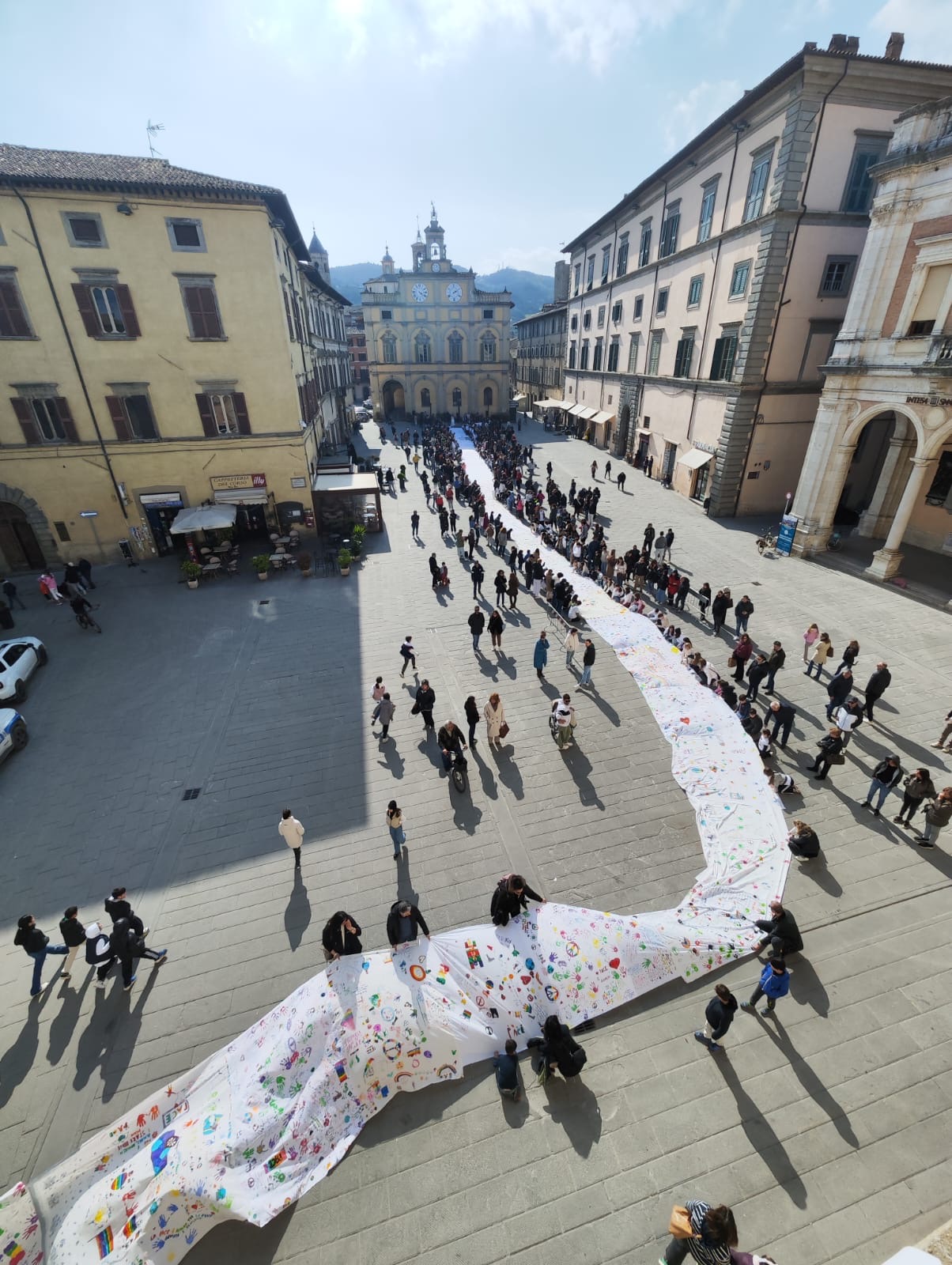 La eco-bandiera collettiva della pace più lunga del mondo dedicata a Papa Francesco e al Presidente della Repubblica, Sergio Mattarella, “pilastri” della fratellanza fra i popoli e democrazia. Un maxi-telo bianco di quasi 100 metri di lunghezza (97 per la precisione) e 2 metri e trenta di larghezza con i disegni, messaggi, pensieri colorati scritti da 800 bambini e studenti delle scuole primarie e secondarie della città e di altre nazioni, è stato srotolato come da programma subito dopo le ore 16 fra due ali di folla commossa e partecipe di un evento unico nel suo genere che segna in maniera indelebile un periodo storico cupo e difficile, fra guerre e conflitti ad ogni latitudine che mettono a serio rischio la convivenza futura. “Un messaggio positivo di speranza e di fraternità che oggi tutti insieme vogliamo dedicare al mondo ed in particolare a Papa Francesco e al Presidente della Repubblica, Sergio Mattarella, da sempre protagonisti del messaggio di pace”, hanno gridato in coro i numerosi presenti. Tutto ha preso inizio dal primo lenzuolo, una parte del “corredo” della nonna della promotrice dell’evento unico nel suo genere, Moira Lena Tassi, poliedrica artista da tempo impegnata a realizzare progetti di grande impatto sociale. A quel lenzuolo con le prime parole riferite alla pace scritte dai bambini in lingue diverse se ne sono aggiunti tanti altri, in tessuti riciclati, poi cuciti ed assemblati fino a comporre una vera e propria opera d’arte finale da guinness dei primati soprattutto per il modo in cui è stata realizzata, in maniera collettiva. L' artista ha guidato gli alunni nella realizzazione della bandiera della pace collettiva più lunga del mondo, attraverso percorsi didattici concordati con i docenti per promuovere l'educazione alla fratellanza fra i popoli. Il progetto, “Visioni senza tempo, tra umanità e sogni di speranza” (con i patrocini del Comune di Città di Castello, dell’Assemblea Legislativa dell’Umbria, della Provincia di Perugia, della Fondazione Perugiassisi per la cultura della pace, della Diocesi di Città di Castello, della Fondazione Italo Bolano ed altre collaborazioni) si è svolto attraverso una serie di incontri nelle scuole partecipanti, durante i quali gli studenti hanno disegnato e scritto messaggi di pace e di amore su grandi pezzi di stoffa bianca riciclata ( lenzuola usate). Diversi metri della eco-bandiera sono stati realizzati in collaborazione con studenti di diverse nazionalità, diventando un potente simbolo di unione tra i popoli. Un pezzo a Varsavia con il contributo di alcuni studenti polacchi nella scuola "Szkoła Podstawowa nr 2 Przymierza Rodzin", un antico lenzuolo, risalente a quasi un secolo fa donato dall' artista, è stato portato da un gruppo di studenti della scuola secondaria di I° grado Alighieri-Pascoli durante uno scambio culturale nell'ambito del progetto Erasmus. Insieme ai loro coetanei polacchi, hanno trasformato il tessuto in una tela di pace, arricchendolo con disegni e messaggi di fratellanza. Un altro pezzo della eco-bandiera ha preso forma a Laredo, vicino a Bilbao, grazie ai bambini delle quinte elementari dell'Istituto Comprensivo Alberto Burri di Città di Castello. Anche loro, insieme ai coetanei spagnoli, nella scuola elementare "CEIP Pablo Picasso" hanno dato il loro contributo artistico, intrecciando parole e immagini di pace e amore. Questa bandiera, frutto della creatività e dell'impegno di giovani di diversi Paesi, è quindi un emblema internazionale di cooperazione, speranza e solidarietà. Una vera e propria maxi-tela della solidarietà che si è arricchita con un altri toccanti contributi: i bambini e le persone con Sindrome di Down di Casa Virgy (progetto AIPD Perugia), insieme agli operatori e all’ideatrice del progetto, hanno dato vita a un nuovo pezzo di bandiera, frutto della loro creatività e del loro impegno per la pace. Contributo significato al progetto anche da parte dei bambini e bambine del reparto di Pediatria dell’ospedale di Città di Castello. Un’ ulteriore sezione della bandiera poi ha preso forma grazie ai ragazzi diversamente abili del progetto Kreo della Cooperativa “La Rondine”, che, con grande entusiasmo , guidati dagli operatori e dall' artista, hanno trasformato idee ed emozioni in un’ opera simbolo di inclusione e condivisione. Anche gli anziani ospiti della Asp “Muzi Betti” con il prezioso aiuto dei bambini, i talentuosi violinisti dell'orchestra Piccole Scintille, hanno dato forma a un'opera di pace, amore e fratellanza. Sotto la direzione del Maestro violinista Laureta Cuku Hodaj, i giovani musicisti hanno offerto il loro supporto musicale, regalando uno straordinario concerto agli anziani nel salone della casa di cura. La bandiera della pace ha dunque avvolto piazza Matteotti in tutta la sua lunghezza e sulle note di brani “icona” dei diritti umani eseguite dal maestro Fabio Battistelli ed Anthony Guerrini, e l’esibizione delle allieve e allievi del Consorzio Castello Danza con l’apporto della Scuola Comunale di Musica “Giacomo Puccini”, sollevata dai bambini è stata portata in piazza Gabriotti attraverso un percorso di festa e inni alla pace per poi essere posizionata all’interno della cattedrale lungo la navata centrale con una parte che è scesa dalla scalinata che si affaccia suoi giardini del Cassero. Terminati i canti, le persone presenti sono state invitate ad entrare nel Duomo per la preghiera per la pace . “La bandiera destinata a viaggiare in ogni luogo del mondo sarà esposta in tutti i luoghi che parlano di pace, amore e fratellanza”, è stato ribadito al termine della preghiera del Vescovo, Luciano Paolucci Bedini, affiancato dal vicario Don Andrea Czortek, con accanto il sindaco di Città di Castello, Luca Secondi e i rappresentanti istituzionali locali, provinciali, regionali e nazionali. Sono stati proprio il sindaco ed il vescovo a scrivere poi su una parte della bandiera un pensiero per la 