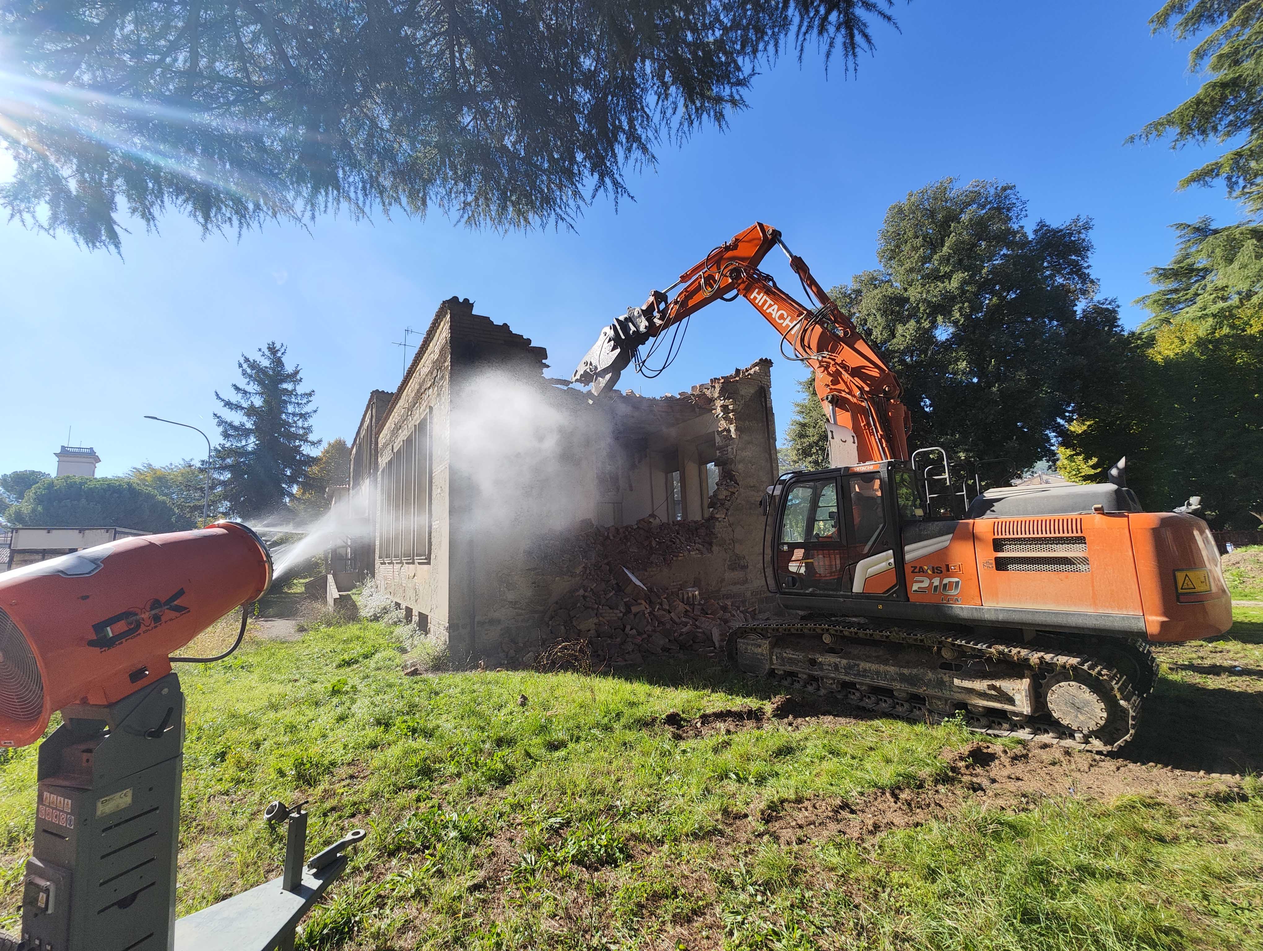 Scheda. La scuola Garibaldi fu costruita a metà degli anni ’50 del ventesimo secolo. Fino ai primi anni ’80 venne utilizzata come plesso scolastico per poi essere destinata agli uffici comunali fino al 2010. L’intervento comprende un’area pianeggiante di circa 4.500 metri sita a ridosso delle mura urbiche. La struttura è costituita da un corpo di fabbrica con pianta rettangolare delle dimensioni di circa 60 per 15 metri lineari, con un’altezza massima di 9,60 metri lineari. Nell’edificio è presente una parte interrata delle dimensioni di circa 180 metri quadrati e dell’altezza di circa 2.60 metri lineari. Il complesso, realizzato in muratura di mattoni e pietra, era in cattivo stato di conservazione e presentava il rischio di crollo dei solai, incluso quello di copertura, in particolare a causa di possibili scosse sismiche. Il progetto prevede la demolizione totale dell’edificio, comprendente anche il piano interrato e le fondazioni, con l’utilizzo di escavatori dotati di attrezzature specifiche (benne e martelli demolitori) per abbattere muri portanti, solai, copertura. In ragione della cubatura esistente, i tecnici responsabili dell’intervento hanno stimato che il materiale proveniente dalla demolizione totale del fabbricato raggiungerà i 7.300 metri cubi. Nella fase di abbattimento si provvederà alla separazione selettiva delle diverse componenti: plastica, legno, metallo, parti in muratura, calcestruzzo. Ogni diverso materiale verrà poi accatastato separatamente e quindi avviato ad un processo di recupero, di riciclo o riuso. La demolizione sarà portata avanti nelle prossime settimane adottando tutte le tecniche che possano mitigare la produzione di polveri e di rumore. La realizzazione di nuovi parcheggi prevedrà le seguenti fasi: rimozione della vegetazione esistente; scoticamento del terreno con l’utilizzo dei mezzi meccanici nelle aree dove si andranno a realizzare i nuovi parcheggi e la viabilità interna; riempimento dei volumi del piano interrato e delle fondazioni con il materiale frantumato di risulta della demolizione. realizzazione della massicciata sull’area oggetto d’intervento attraverso la posa del materiale di risulta frantumato; posa del rivestimento misto stabilizzato sopra la massicciata fino al raggiungimento della quota progettuale, al fine di creare un ultimo strato solido adatto alla carrabilità dei veicoli; realizzazione della cordonatura in calcestruzzo necessaria per il successivo fissaggio dei blocca ruota in gomma per la delimitazione dei singoli parcheggi; installazione di segnaletica orizzontale e verticale per la regolazione della circolazione interna e la sicurezza degli utenti fruitori.